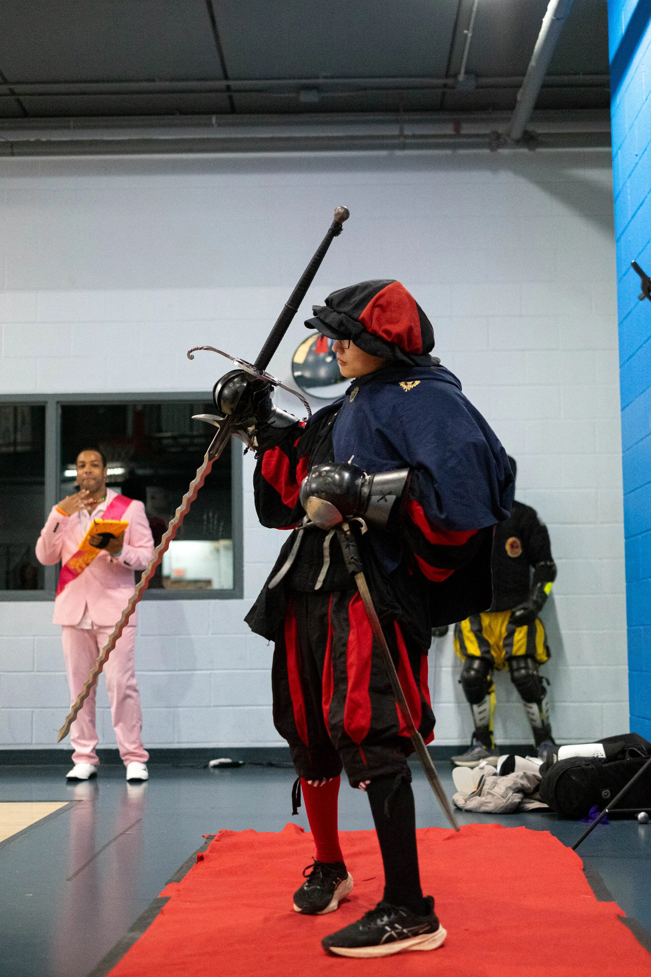 Sanghyun Sheen’s commitment to the red and black motif is as on point (pun intended) as his fencing! The montante, saber, and matching hat serves look and hard as it slays!