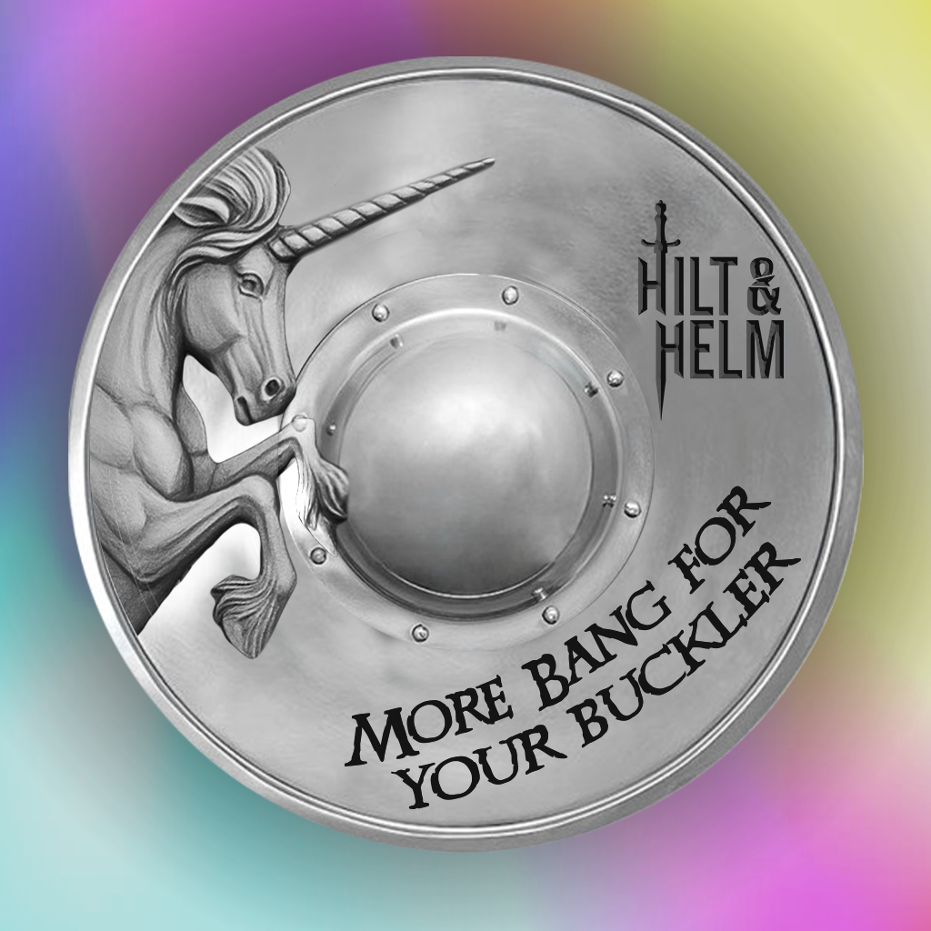 On October 19th, Hilt and Helm hosted our very first rare weapons tournament: More Bang for your Buckler 2025. After competing in Duel for the Jewel 2023 and getting my first for-real-zies gold medal in side sword, I was pretty displeased when they decided to shift to single rapier the following tournament. There are hardly any side sword tournaments at all, so we decided to throw our own! More Bang for your Buckler was actually the name of one of our Pillowfecht in house tournaments. A name that good bared repeating so we threw that weapon plus small sword into the tournament queue. For those of you who aren’t in our discord, there was a rather humorous evolution of the event logo. Initially, this was my first swing at creating it.