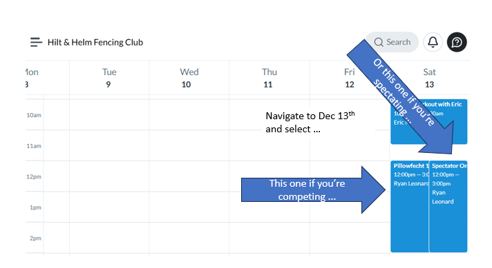 Navigate the Calendar to “December 13th” and select the left one if you are competing or the right one if you are just spectating.