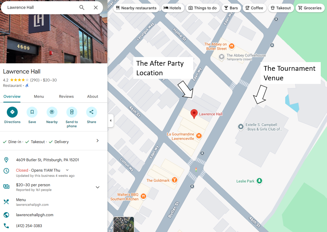 This yea we will be having the official after party at Lawrence Hall which is LITERALLY right across the street from the tournament venue!